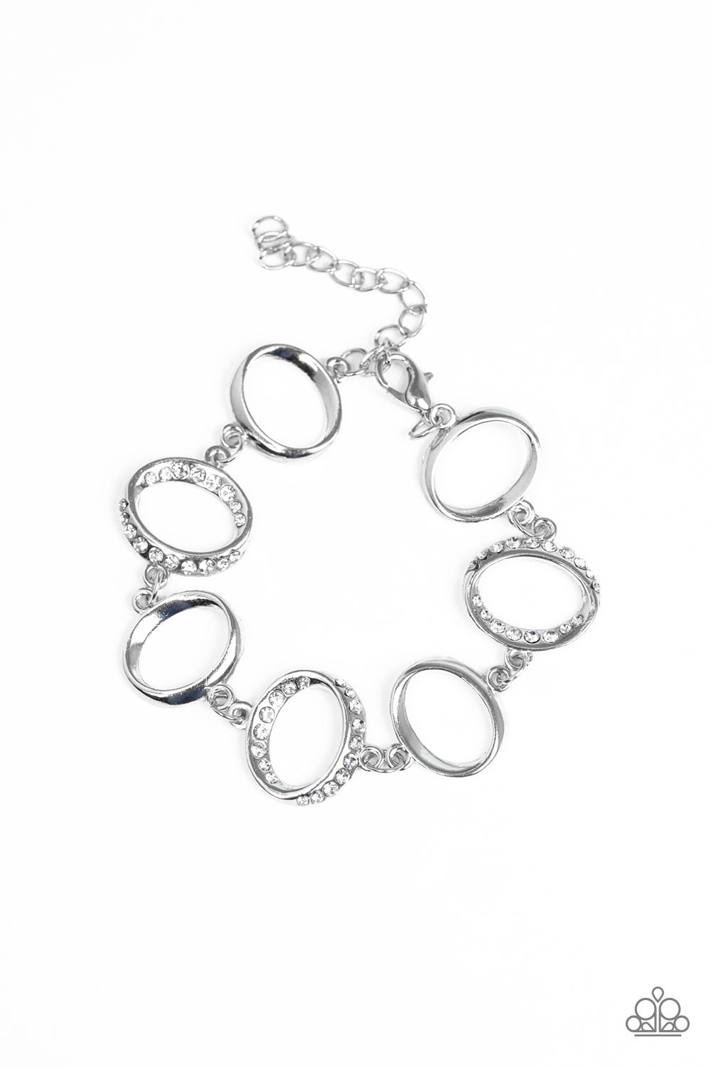 Glistening silver hoops link with white rhinestone encrusted hoops around the wrist for a timeless shine. Features an adjustable clasp closure.