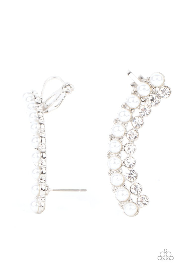 Featuring classic silver fittings, two rows of dainty white pearls and glassy white rhinestones arch into a timeless statement piece. Earring attaches to a standard post earring. Features a clip-on fitting at the top for a secure fit.