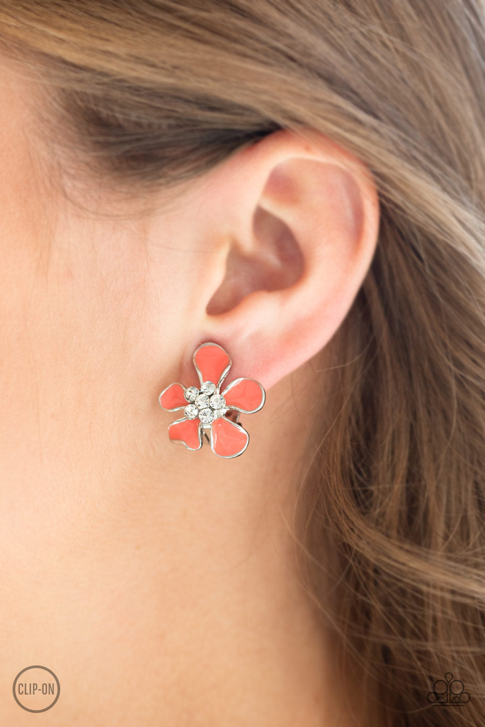 Brushed in a shiny finish, glistening orange petals bloom from a white rhinestone encrusted center for a seasonal flair. Earring attaches to a standard clip-on fitting. Sold as one pair of clip-on earrings. Clip On Earring