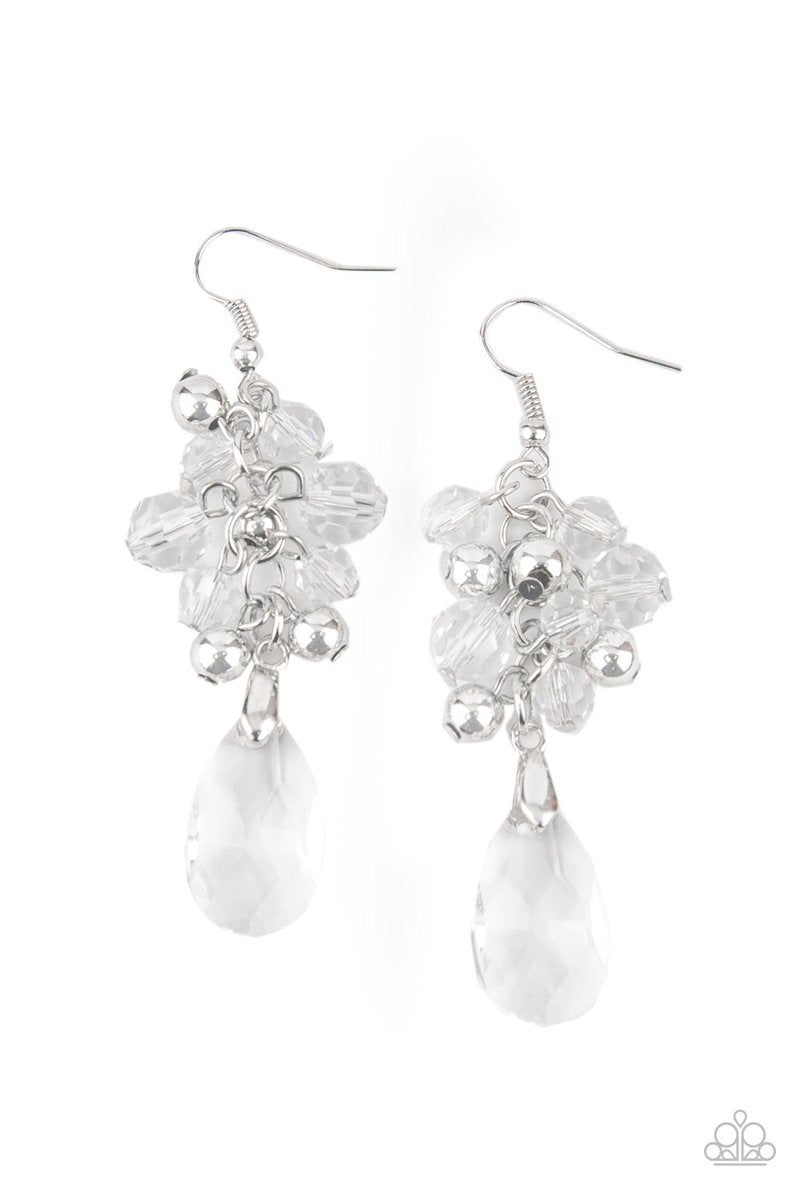 An array of faceted white crystal-like beads and shiny silver beads trickles along a lengthened silver chain, giving way to a matching white crystal-like teardrop for a dramatic chandelier effect. Earring attaches to a standard fishhook fitting.