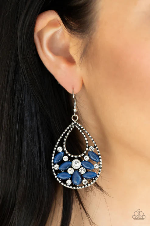 A dazzling collection of glittery white rhinestones and dewy blue cat's eye stones are sprinkled across the bottom of a studded silver teardrop, creating a refined display. Earring attaches to standard fishhook fitting.