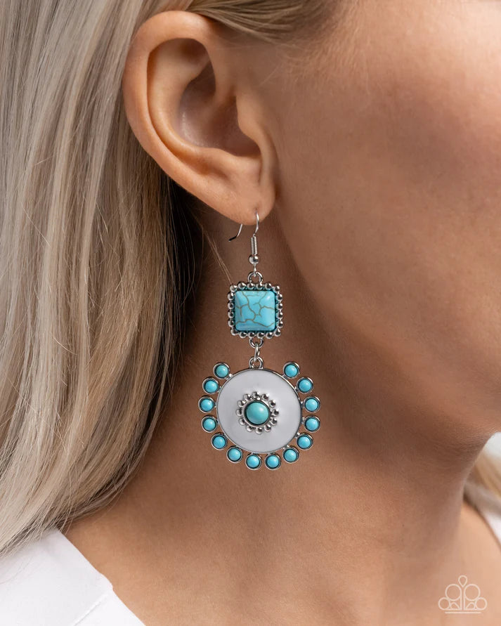 Featuring a border of silver studs, a turquoise stone square gives way to a white-painted circular silver disc where a border of silver studs borders a turquoise beaded center. Additional turquoise beads set in circular silver fittings border three-fourths of the white-painted disc for a pop of earthy elegance. Earring attaches to a standard fishhook fitting. As the stone elements in this piece are natural, some color variation is normal.