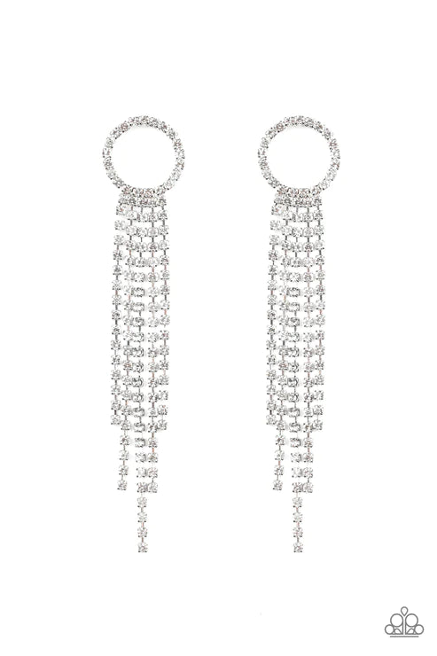 Infused with sleek silver fittings, strands of glittery white rhinestones cascade from the bottom of a white rhinestone encrusted hoop, creating an elegantly tapered fringe. Earring attaches to a standard post fitting.