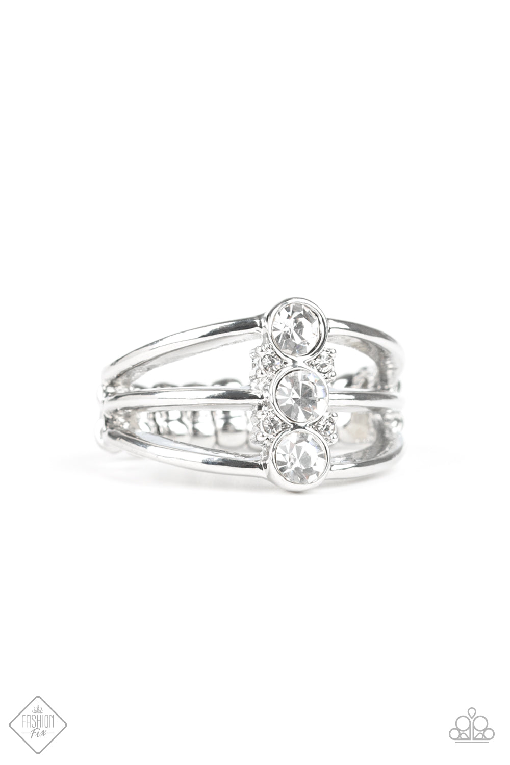 Glistening silver bands arc across the finger, coalescing into an airy frame. Three white rhinestones are encrusted down the center of the bands, adding a refined sparkle to the piece. Features a dainty stretchy band for a flexible fit.