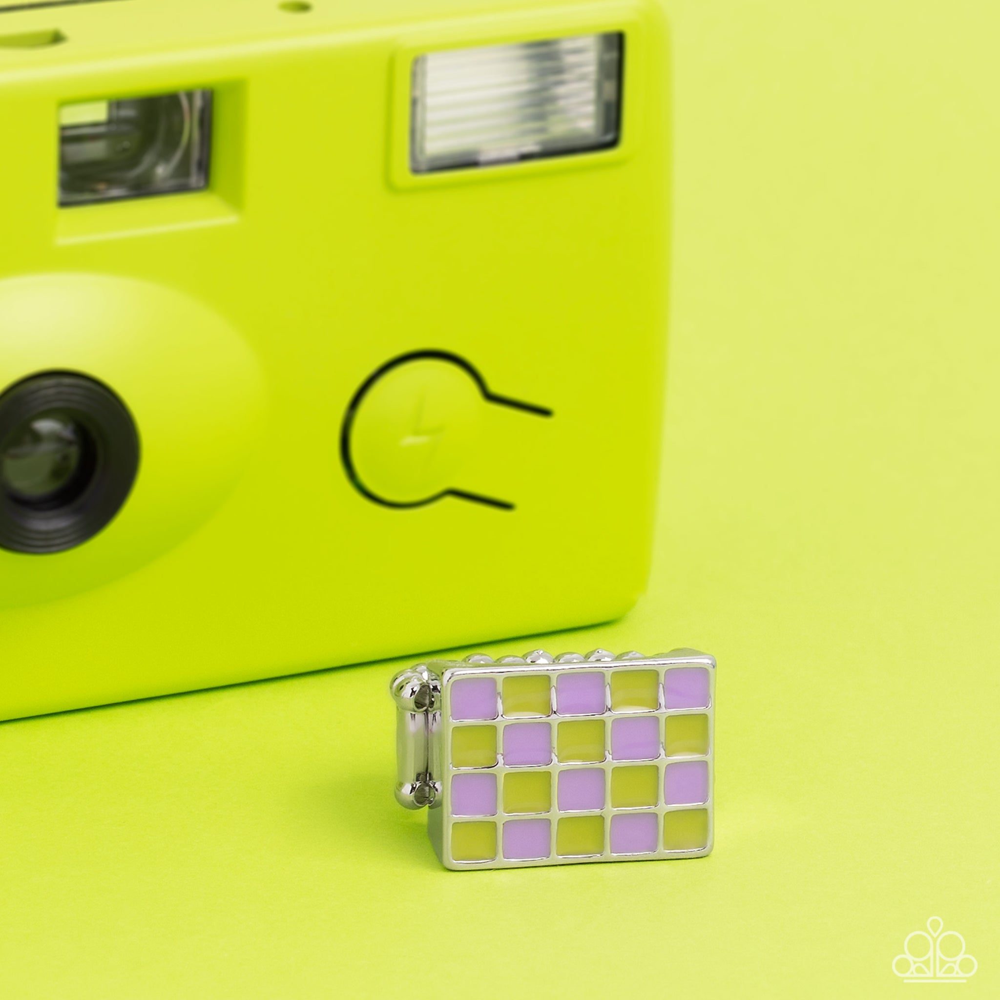 Featuring a thick silver square surface, linear rows of Leek Green squares alternate with lavender squares for a colorful checkerboard statement atop the finger. Features a stretchy band for a flexible fit.