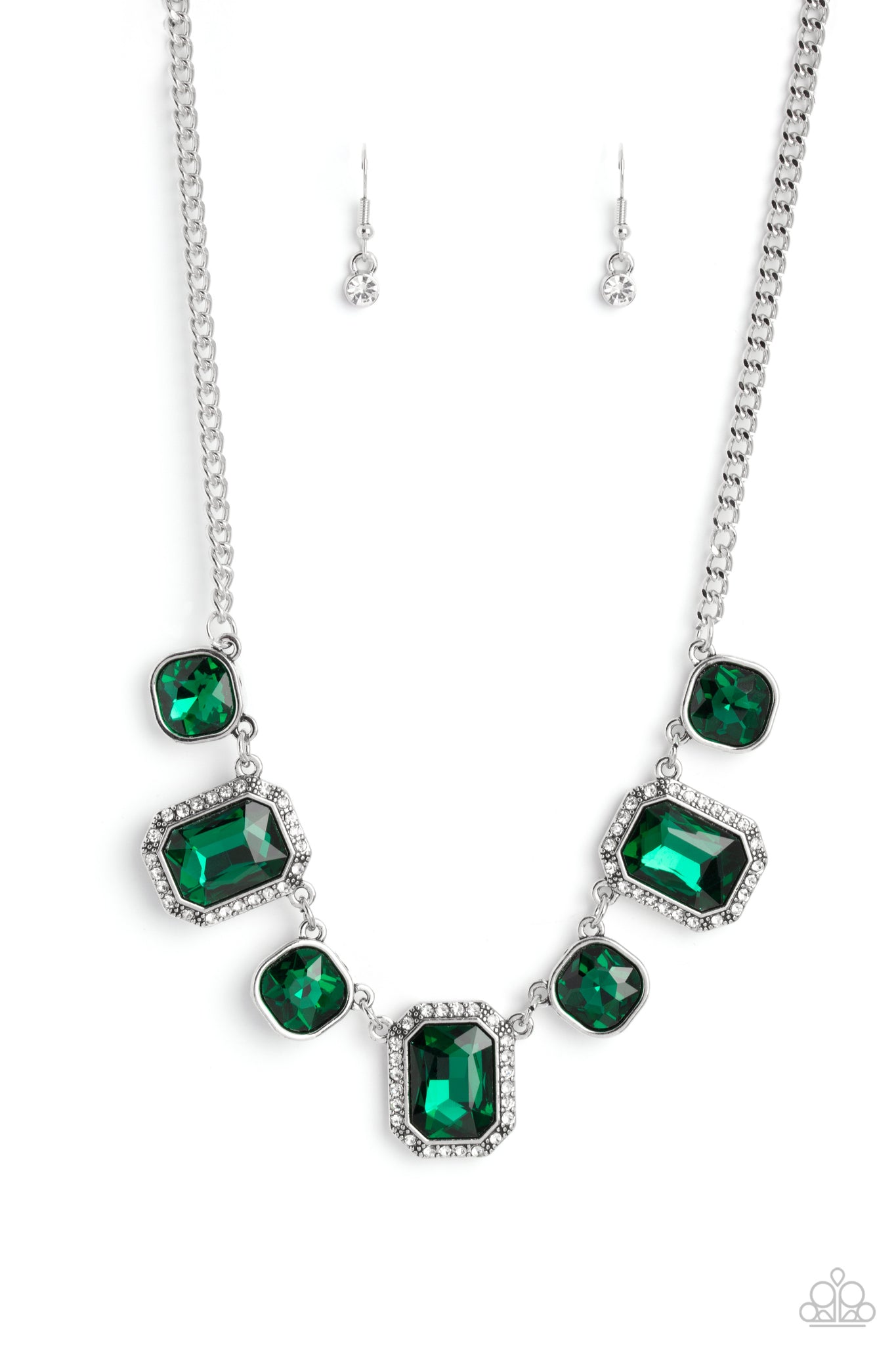 Dazzling gems, in both round and emerald-cuts, fall along the collar in an alternating pattern. Each gem is splashed in an emerald green hue amplifying its impact, while the emerald-cut gems showcase some glittery bling with a border of tiny white rhinestones. Features an adjustable clasp closure.