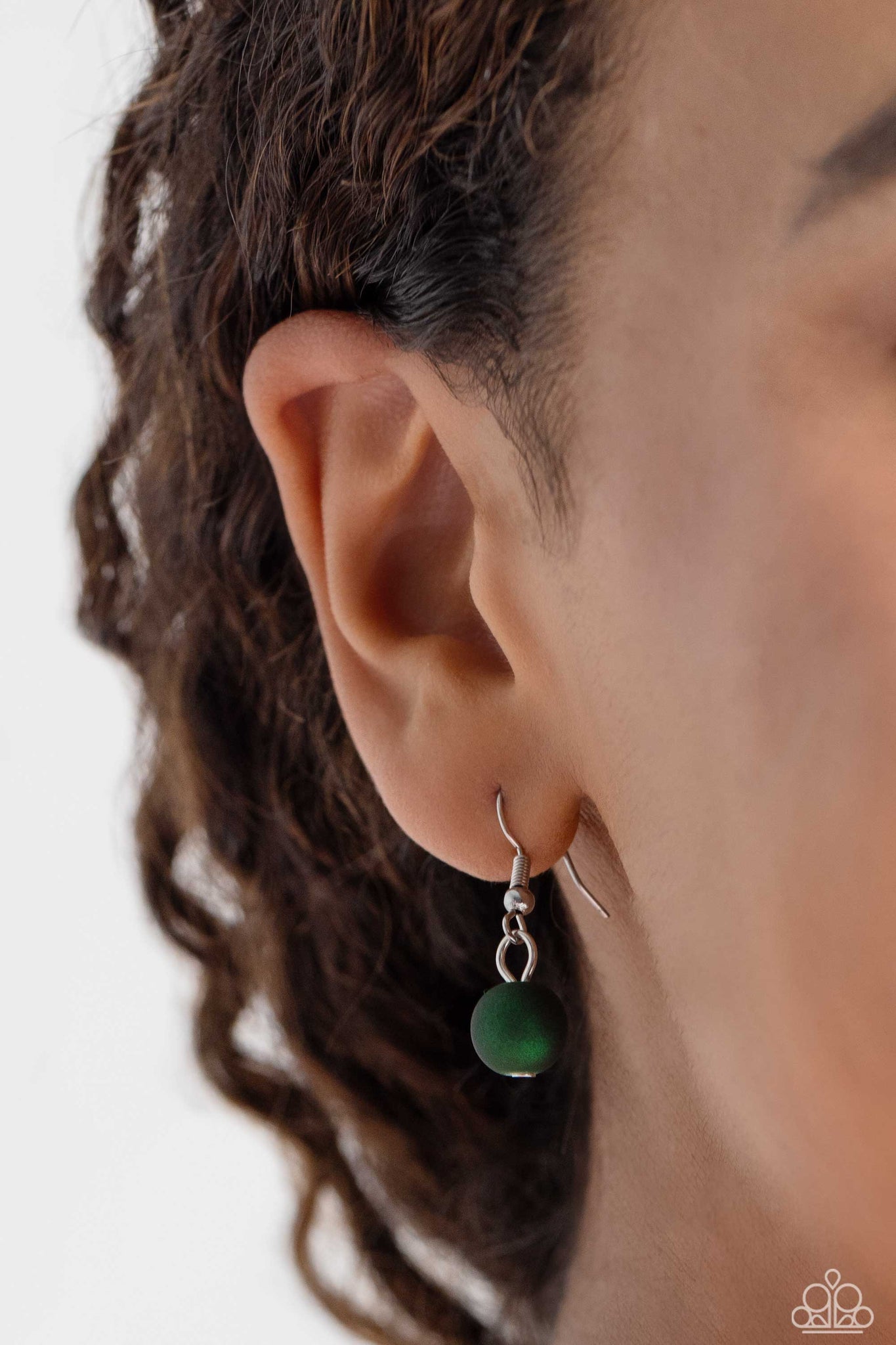 Two rows of oversized emerald green beads featuring a subtle shimmer, silver accents, and clear gray cubed beads fall below the collar on silver paperclip chains, creating refined, colorful layers. Features an adjustable clasp closure.
