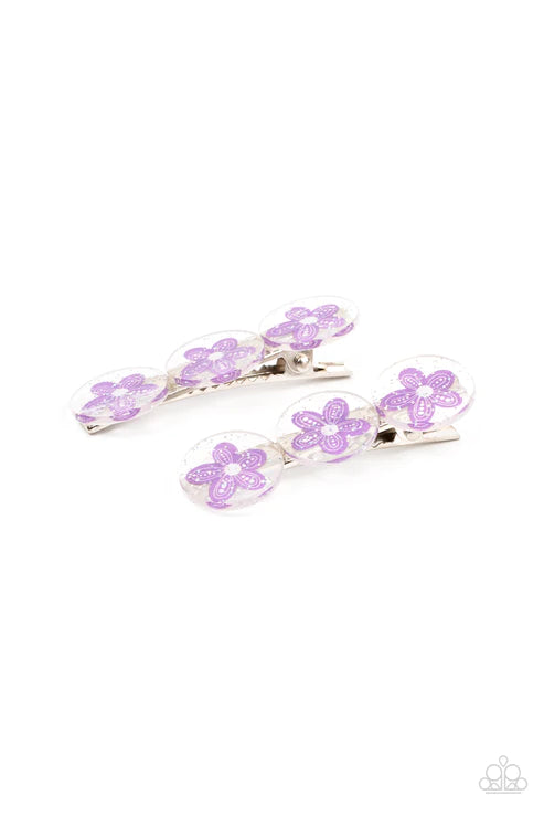 Sprinkled in silvery sparkles, trios of purple flower adorned acrylic discs join into a whimsical pair of hair clips. Features standard hair clips on the back.