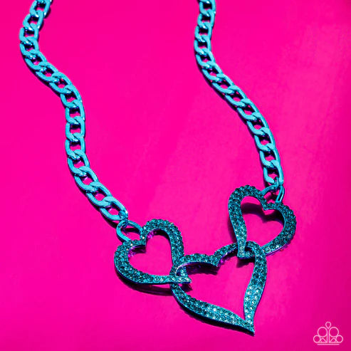 Cascading from an electric blue curb chain, a trio of rhinestone-embellished hearts featuring an ombré effect of blue to aquamarine shimmers and shines around the neckline for a seasonal statement. Features an adjustable clasp closure.