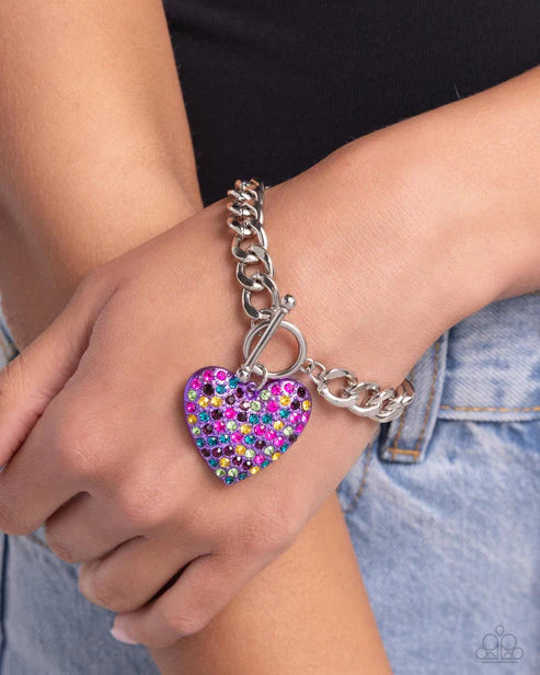 Featuring a collection of multicolored rhinestones, a purple heart-shaped pendant sparkles from a toggle closure at the center of a silver curb chain for a flirtatious fashion around the wrist. Features a toggle closure.
