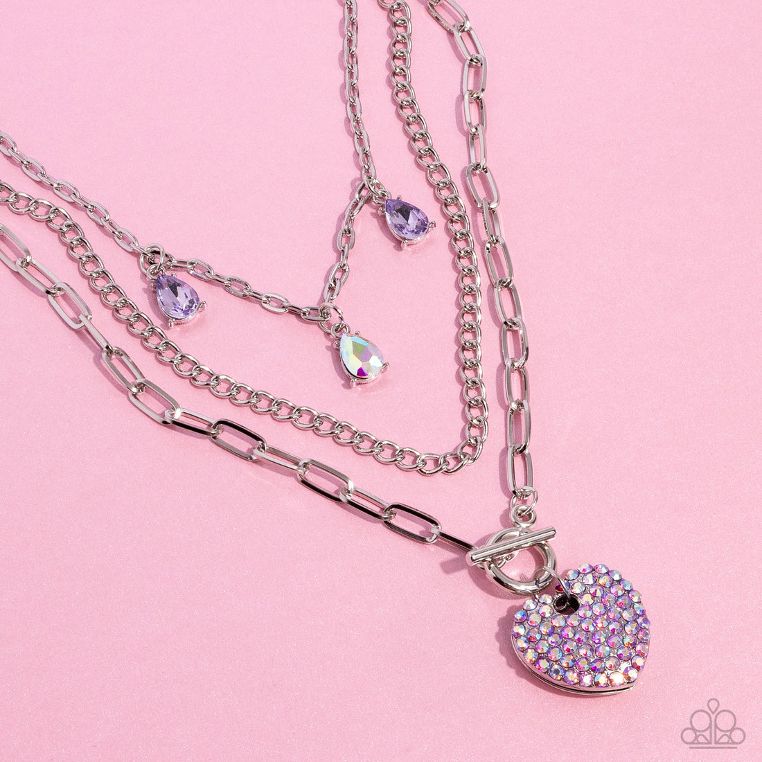 Three mismatched silver chains layer and loop around the neckline. Two purple and an iridescent teardrop gem in silver-pronged fittings dangle from the uppermost chain while a lavender iridescent-rhinestone encrusted heart pendant loops through the lowermost chain for a radiantly, romantic statement. Features an adjustable clasp closure. Due to its prismatic palette, color may vary.