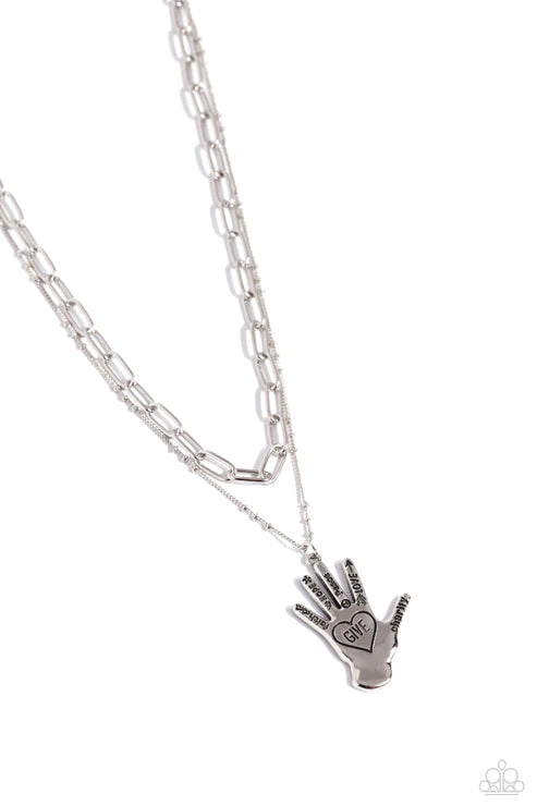 Layered beside a silver paperclip chain, a silver satellite chain with a silver hand charm cascades down the chest for a seasonal statement. Stamped on each silver finger, words like "faith," "hope," "peace," "love," and "charity" stand out while the palm hosts a stamped heart with the word "give" for an inspiring finish. Features an adjustable clasp closure.