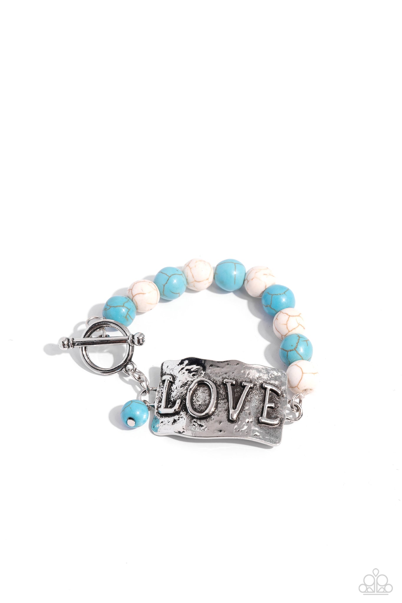 Infused along an invisible chain, round turquoise and white stone beads encircle the wrist connecting to a scalloped silver plate that features the word "LOVE." A solitaire turquoise bead dangles from the antiqued plate for additional earthy detail. Features a toggle clasp closure. As the stone elements in this piece are natural, some color variation is normal.