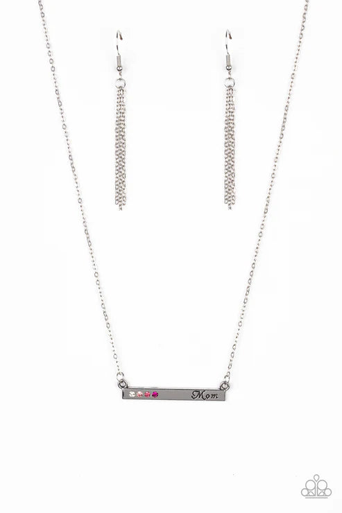 Dotted in dainty rhinestones that fade from white to dark pink, a dainty silver rectangular frame stamped in the word, "Mom", is suspended by a dainty silver chain below the collar for a charming look. Features an adjustable clasp closure.