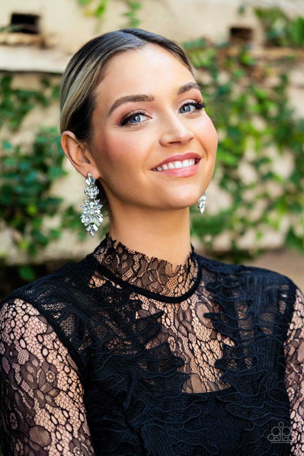 Featuring white and white finishes, trestles of round, marquise, and emerald cut rhinestones cluster into three sparkly segments as they link into a jaw-dropping lure. Earring attaches to a standard post fitting. Due to its prismatic palette, color may vary.