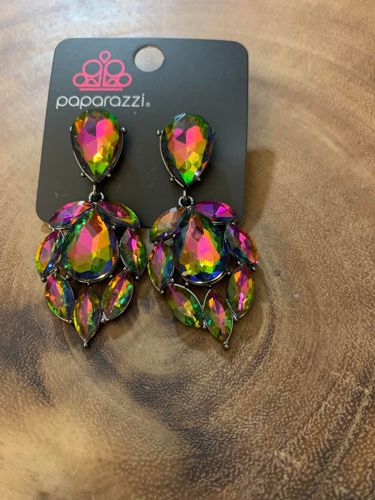 A stellar collection of marquise cut oil spill rhinestones nestle around an oversized teardrop oil spill rhinestone, creating a dramatically stellar display at the bottom of a matching oil spill teardrop rhinestone. Earring attaches to a standard post fitting.