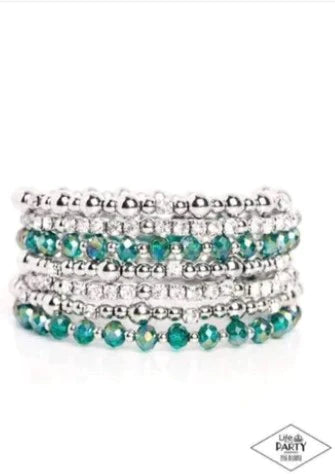 An icy collection of silver beads, cubes, opaque green crystals with an iridescent shimmer, and glassy white rhinestones are threaded along a coiled wire, creating a blinding infinity wrap style bracelet around the wrist. Due to its prismatic palette, color may vary.