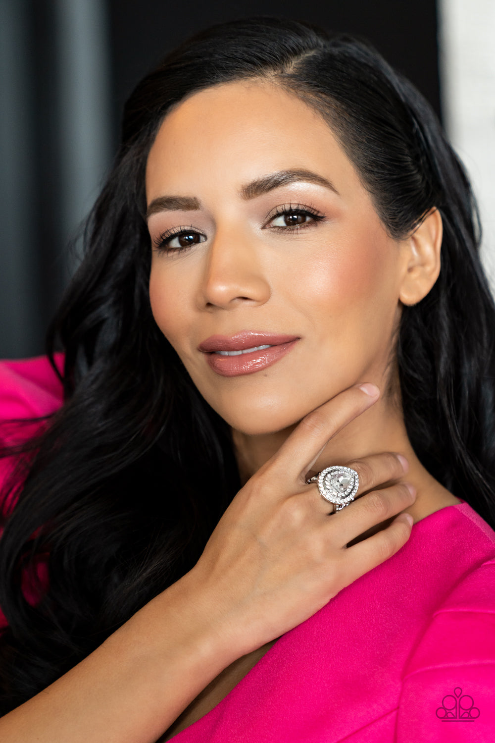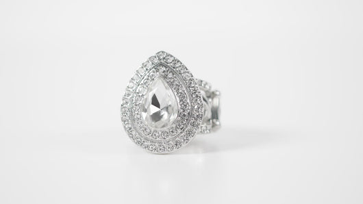 A dramatically oversized white teardrop gem twinkles inside two borders of glassy white rhinestones, resulting in a sparkly statement atop the finger. Features a stretchy band for a flexible fit.