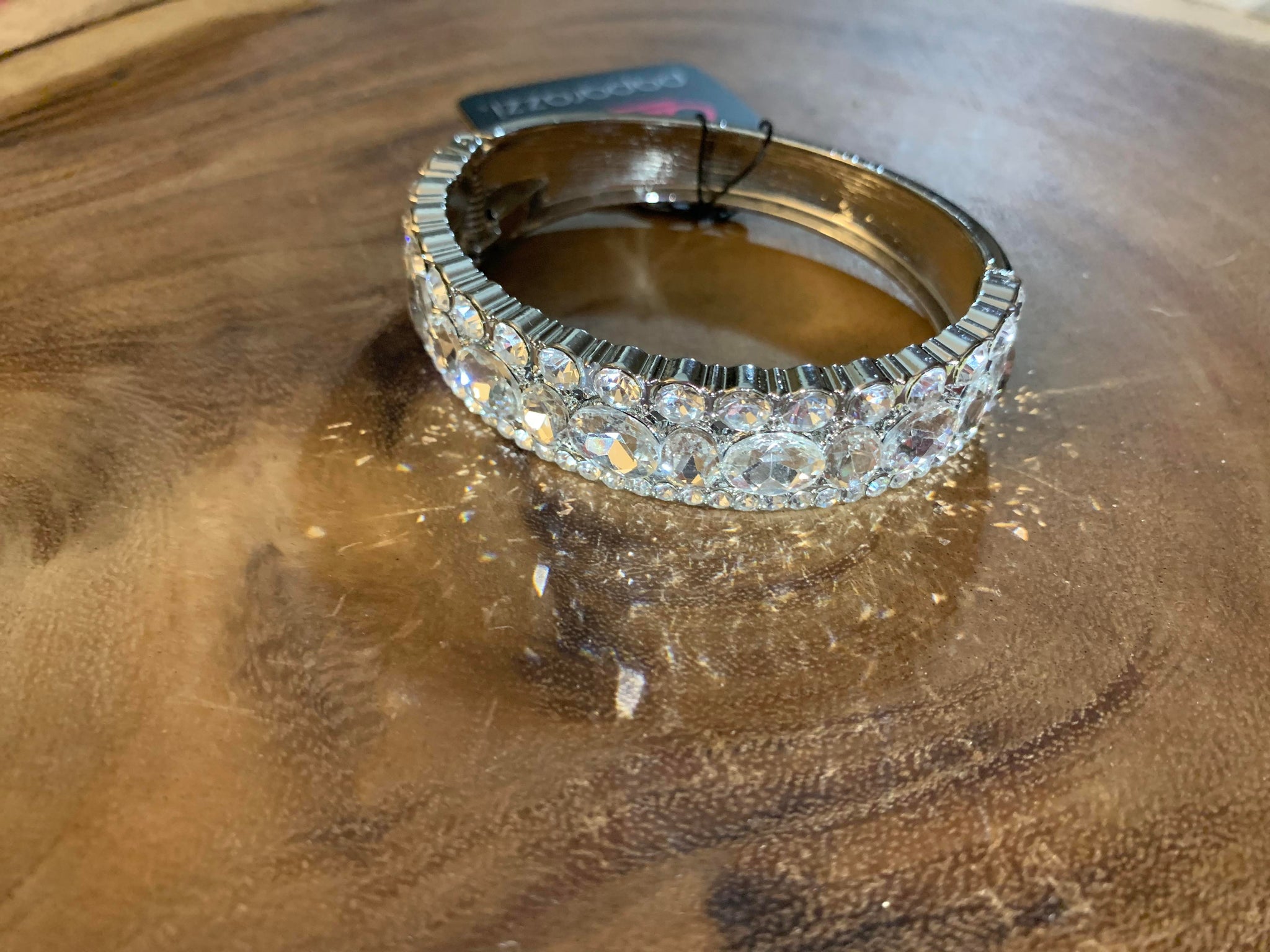 Three blinding rows of mismatched white rhinestones dramatically stack across the wrist, coalescing into a majestic bangle-like centerpiece. Features a hinged closure.