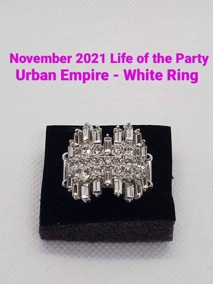 Staggered rows of emerald cut rhinestones flare out from the top and bottom of an explosion of classic white rhinestones, creating a smoldering statement piece atop the finger. Features a stretchy band for a flexible fit.