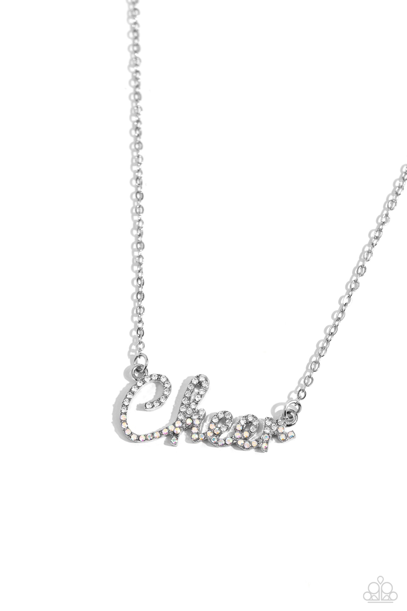 Curled in a script font, glistening silver letters spell out the word "Cheer" along a dainty silver chain. Embossed on the letters, dainty white rhinestones and iridescent rhinestones create a subtle ombré effect for a peppy finish. Features an adjustable clasp closure. Due to its prismatic palette, color may vary.
