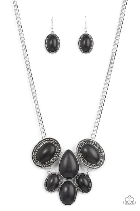 Featuring an assortment of studded, textured, and smooth silver frames, a grounding combination of oversized oval and teardrop black stones links into an exaggerated earthy pendant below the collar for an artisan inspired fashion. Features an adjustable clasp closure.