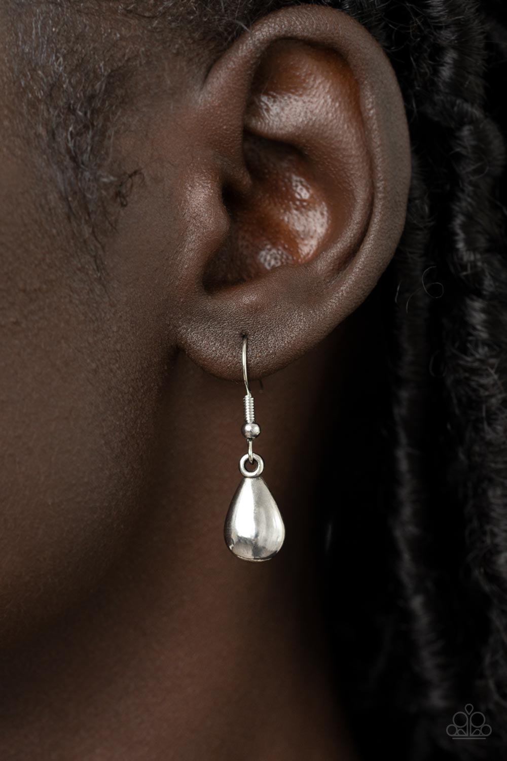 A pair of mismatched chunky silver chains layer below the collar. Shiny silver teardrop beads and white shell-like discs dance from the bottom of the lowermost chain, creating a tropical inspired fringe. Features an adjustable clasp closure.