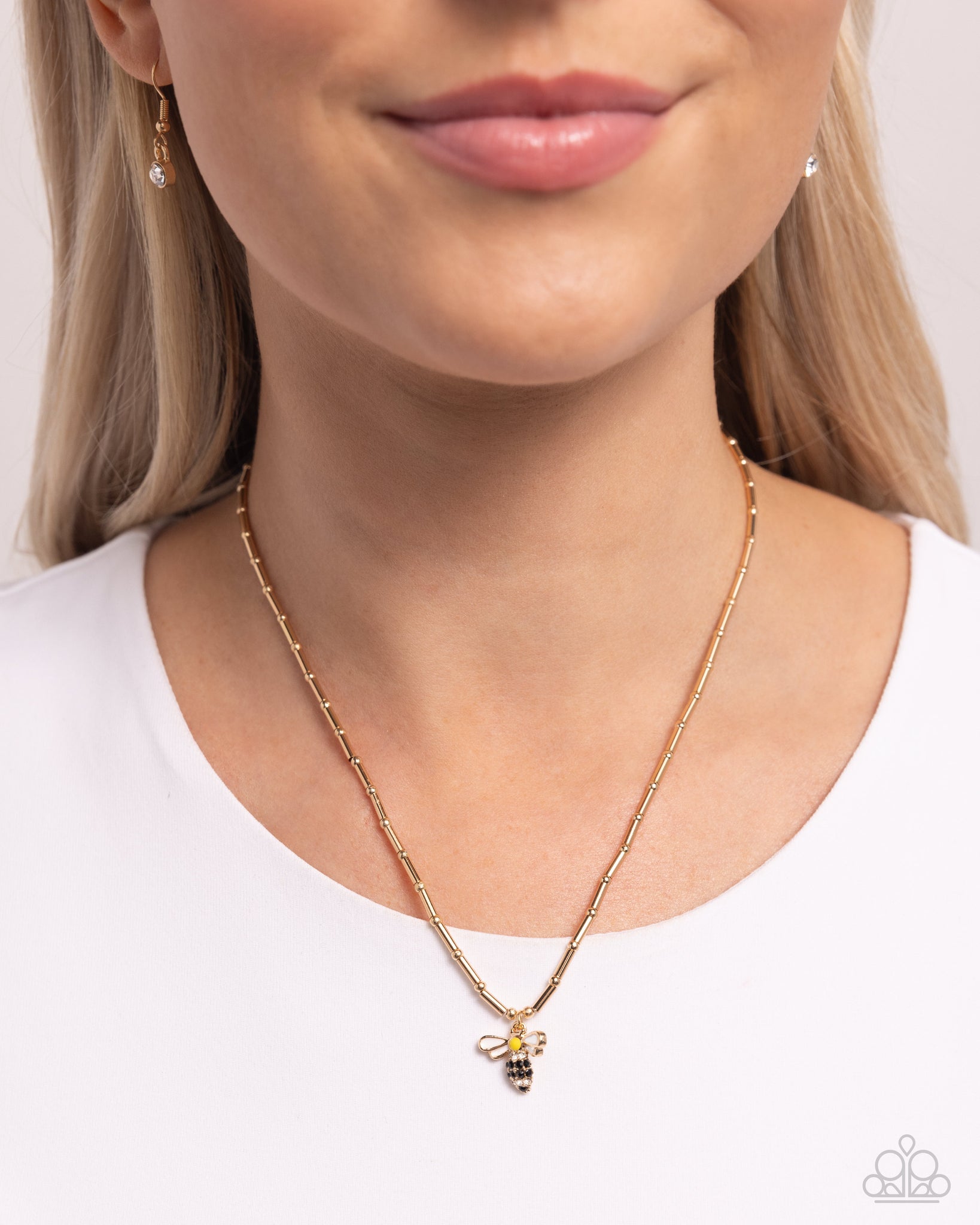 Featuring spots of white and Daffodil Yellow paint, a white and black rhinestone-encrusted bee pendant dances from a solitaire gold ball and bar chain below the collar for a spring-inspired statement. Features an adjustable clasp closure.