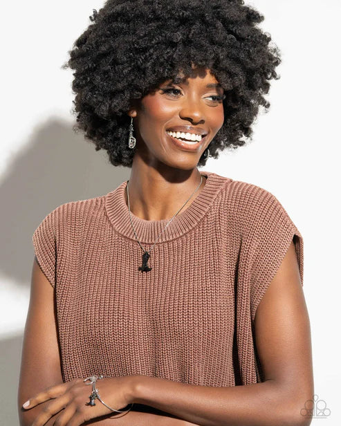 Featuring glossy tactile detailing, a black cowboy boot with a spur attached glides along a silver abstract chain for a Western-inspired look. Features an adjustable clasp closure.