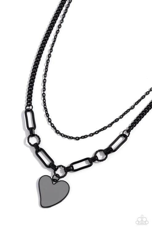 A black-painted dainty chain is layered with a classic black-painted chain with abstract textured and paperclip chain links, finishing off the center of the design. An abstract Ultimate Gray-painted heart dangles from the lowermost chain, creating a charming collision of youthfulness and grit as they lay along the collar. Features an adjustable clasp closure.