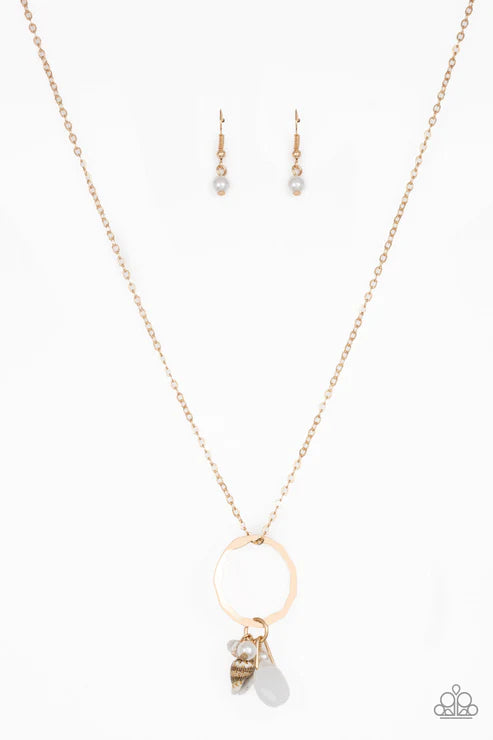 A dainty shell, white crystal-like bead, opaque teardrop, and pearly white beads swing from the bottom of a hammered gold hoop, creating a whimsically clustered pendant below the collar. Features an adjustable clasp closure.