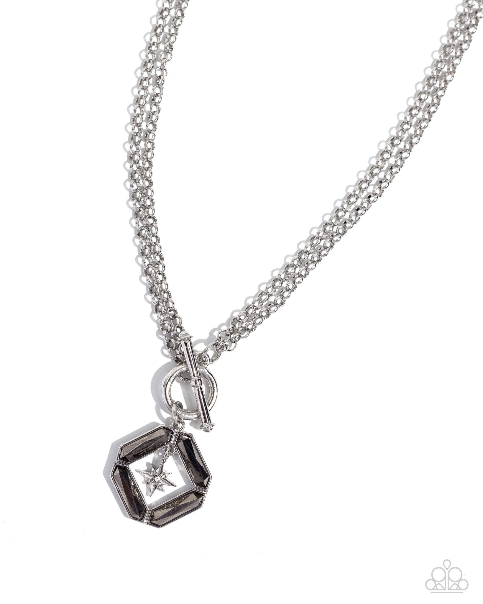 A three-dimensional silver star cascades in the center of an octagonal silver pendant, featuring smoky gems. The dramatic compass-like pendant attaches to a duo of shiny silver chains, creating a blinding centerpiece below the neckline. Features a toggle closure.