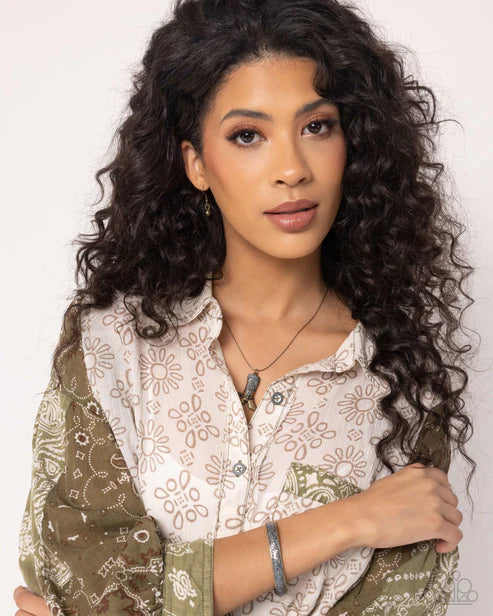 Gliding along an abstract brass chain, a pearl-painted brass cowboy boot with decorative-like stitching and a brass spur creates a western-inspired statement below the neckline. Features an adjustable clasp closure.
