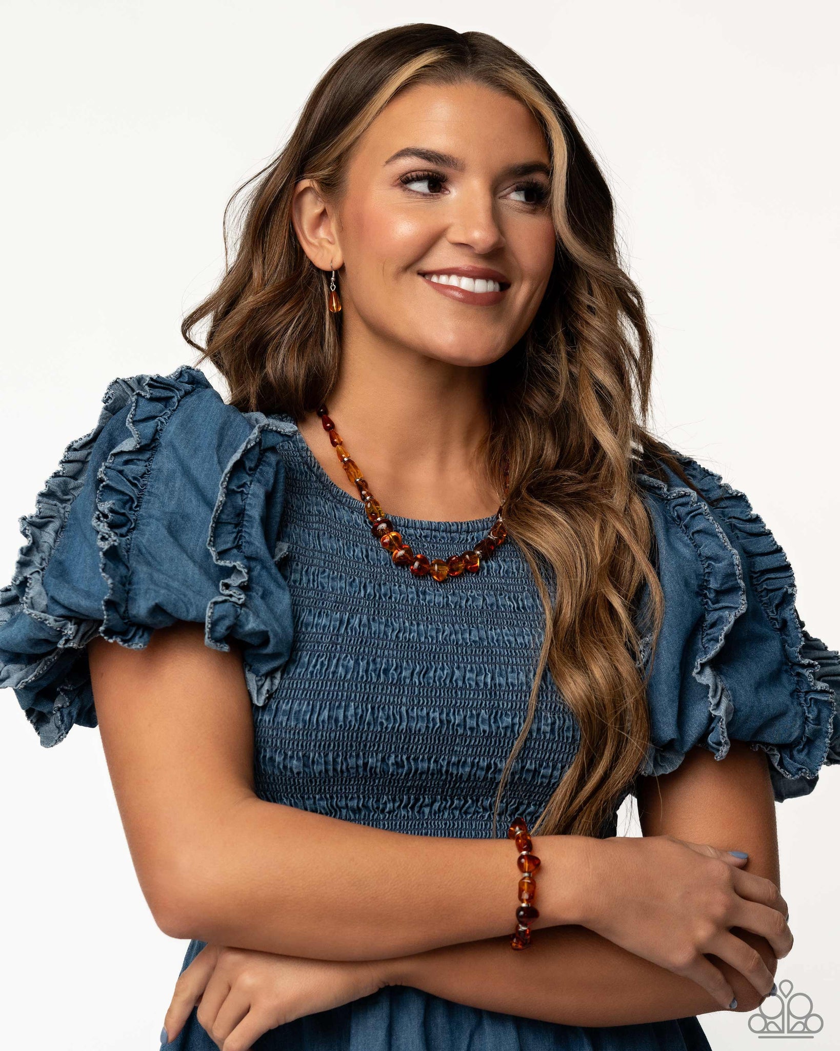 Featuring a glassy opacity, brown beads in various shapes are infused along the neckline for a stylish statement. Silver discs are sporadically inserted throughout the glassy beads for a touch of sheen. Features an adjustable clasp closure.