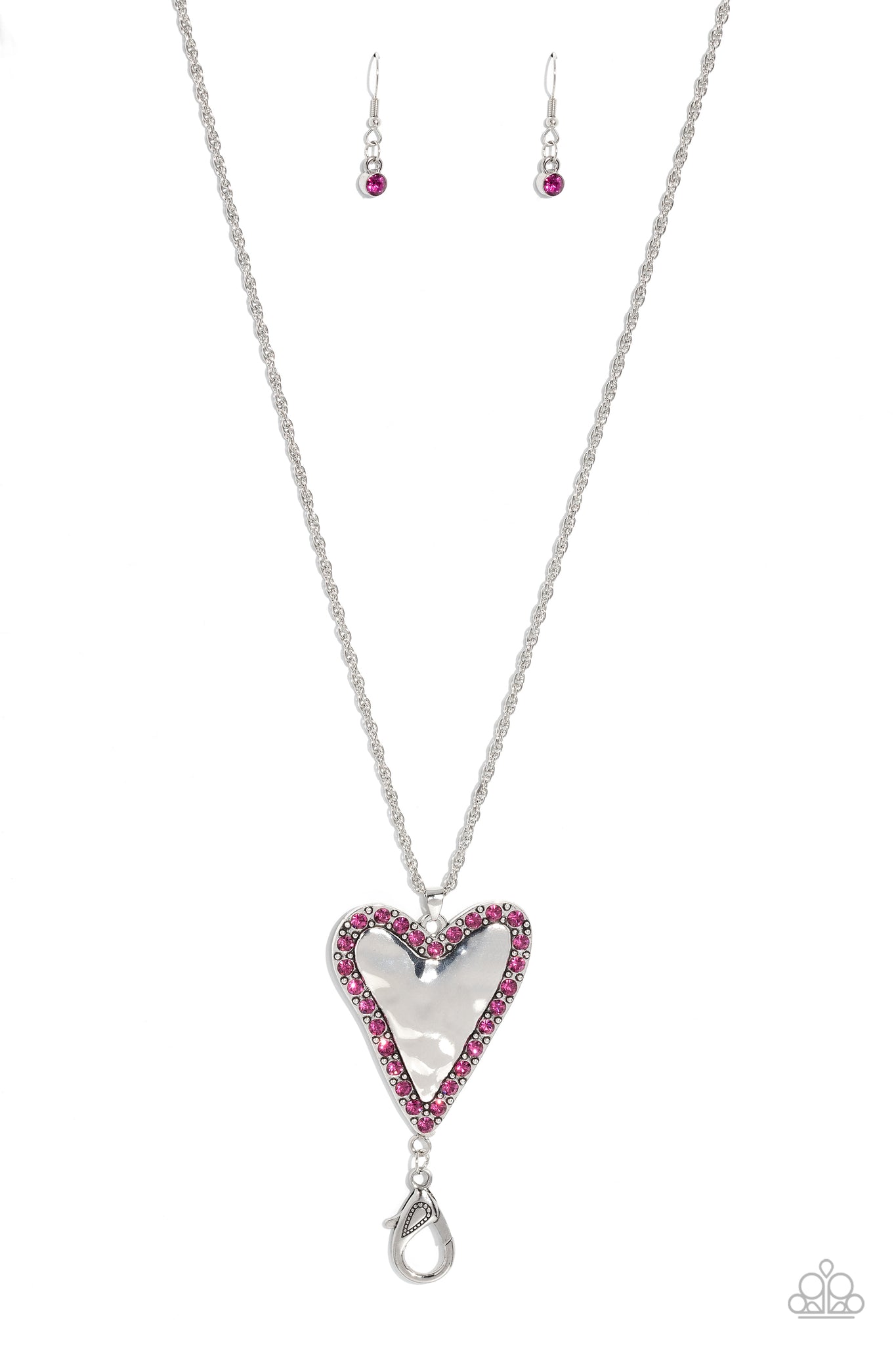 Hammered in antiqued texture, an oversized, abstract silver heart swings from the bottom of a silver chain for a whimsical look. Silver studs and glittery fuchsia gems border the hammered texture for a touch of bling. Features an adjustable clasp closure. A lobster clasp hangs from the bottom of the design to allow a name badge or other item to be attached. Features an adjustable clasp closure.