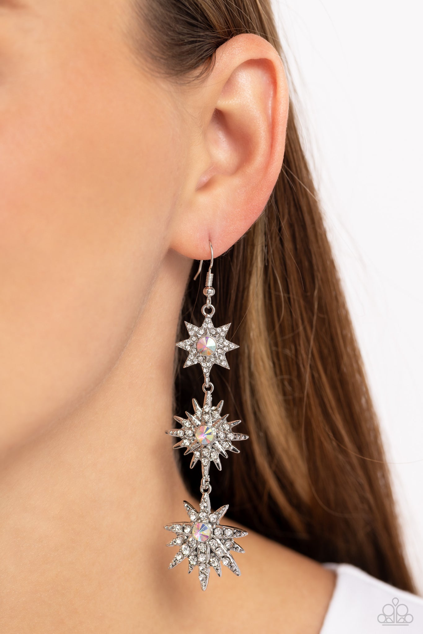 Dotted with iridescent and white rhinestones, a stellar collection of three-dimensional silver stars increase in size as they cascade from the ear for an out-of-this-world fashion. Earring attaches to a standard fishhook fitting. Due to its prismatic palette, color may vary.