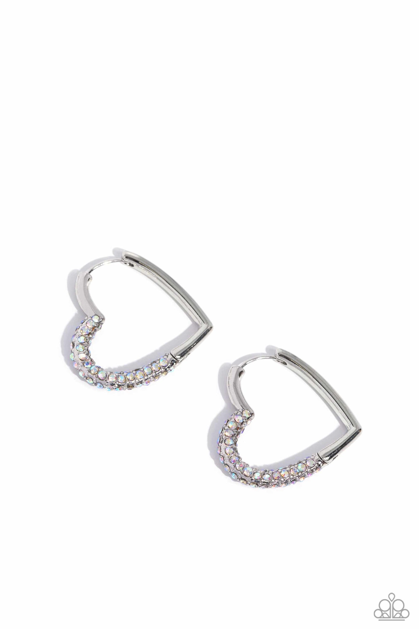 Embossed along one curve of a sleek silver heart-shaped frame, row after row of glittery iridescent rhinestones curls around the ear, leaving a lasting romantic impression. Earring attaches to a standard hinge closure fitting. Hoop measures approximately 1 1/8" in diameter. Due to its prismatic palette, color may vary.