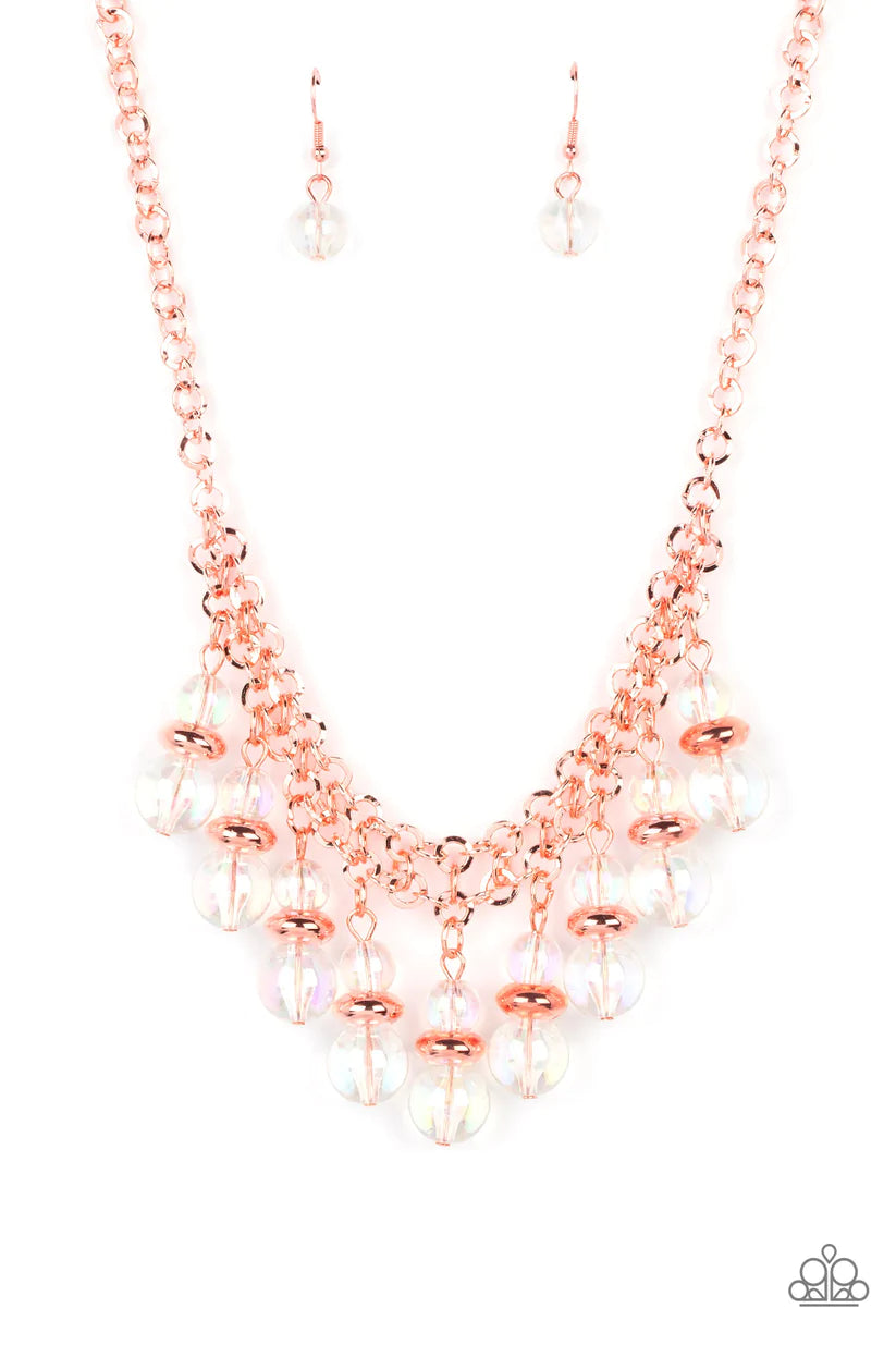 Featuring a stellar iridescence, pairs of glassy beads are separated by shiny gold discs, trickling below the collar in an effervescent fringe. Features an adjustable clasp closure. Due to its prismatic palette, color may vary.