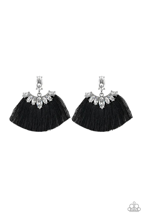 A solitaire marquise-cut rhinestone gives way to a plume of shiny black thread crowned in a matching rhinestone encrusted fringe for a glamorous look. Earring attaches to a standard post fitting.