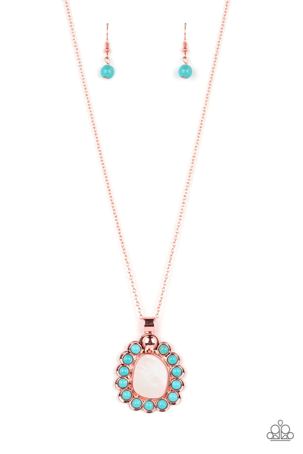 Dangling from a shiny copper chain, an asymmetrical white shell with an opal finish is encircled by a turquoise stone-studded frame, creating a seasonal Southwestern pattern. As the stone elements in this piece are natural, some color variation is normal. Features an adjustable clasp closure.