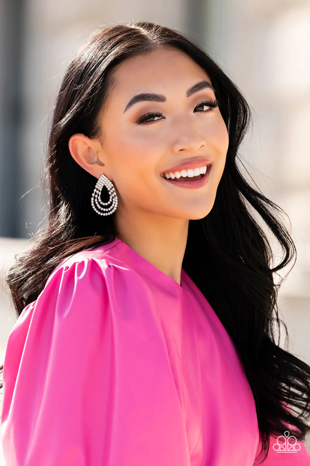 Loops of glassy white rhinestones ripple out from the bottom of a stationary triangular fitting that is dotted in glittery white rhinestones, resulting in a timeless teardrop chandelier. Earring attaches to a standard post fitting.