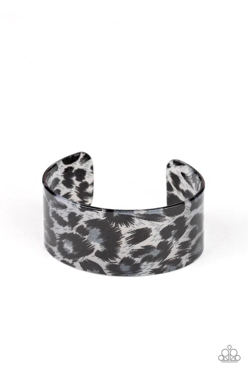Featuring a gray and black cheetah pattern, a thick acrylic cuff curls around the wrist for a wildly retro fashion.