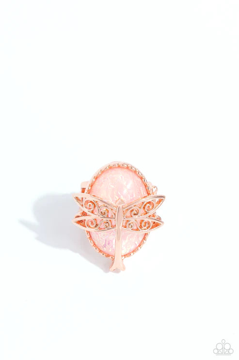 Centered atop a peach opalescent refracted shimmer oval, an ornate, shiny copper dragonfly rests atop a shiny copper serrated frame, creating a whimsically seasonal statement atop airy shiny copper bands on the finger. Features a stretchy band for a flexible fit. Due to its prismatic palette, color may vary.