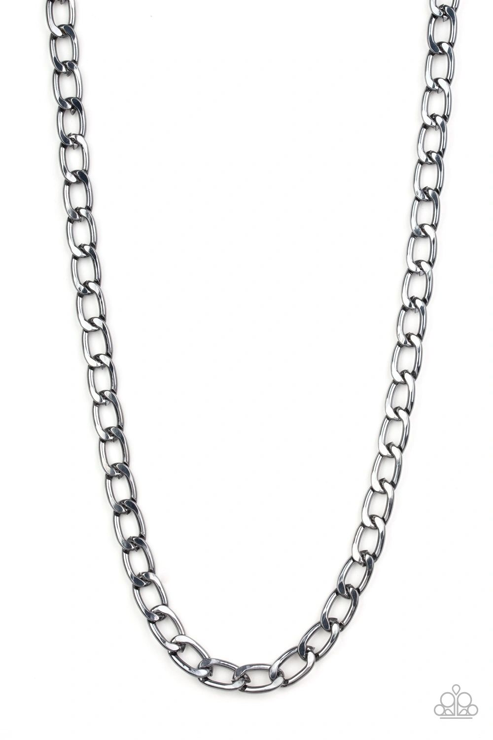 A thick gunmetal beveled cable chain drapes across the chest for a classic look. Features an adjustable clasp closure.