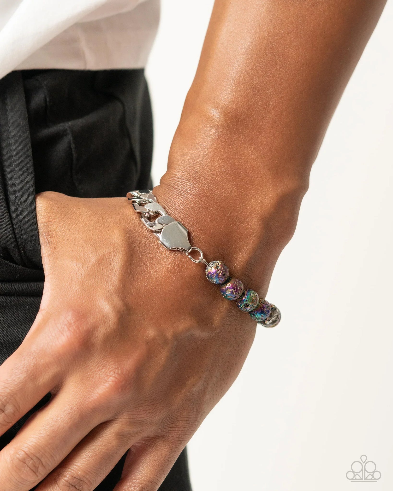 An assortment of oil spill lava rock beads joins an edgy, thick silver curb chain around the wrist for an urban, dramatic flair. Features an adjustable clasp closure. As the stone elements in this piece are natural, some color variation is normal.