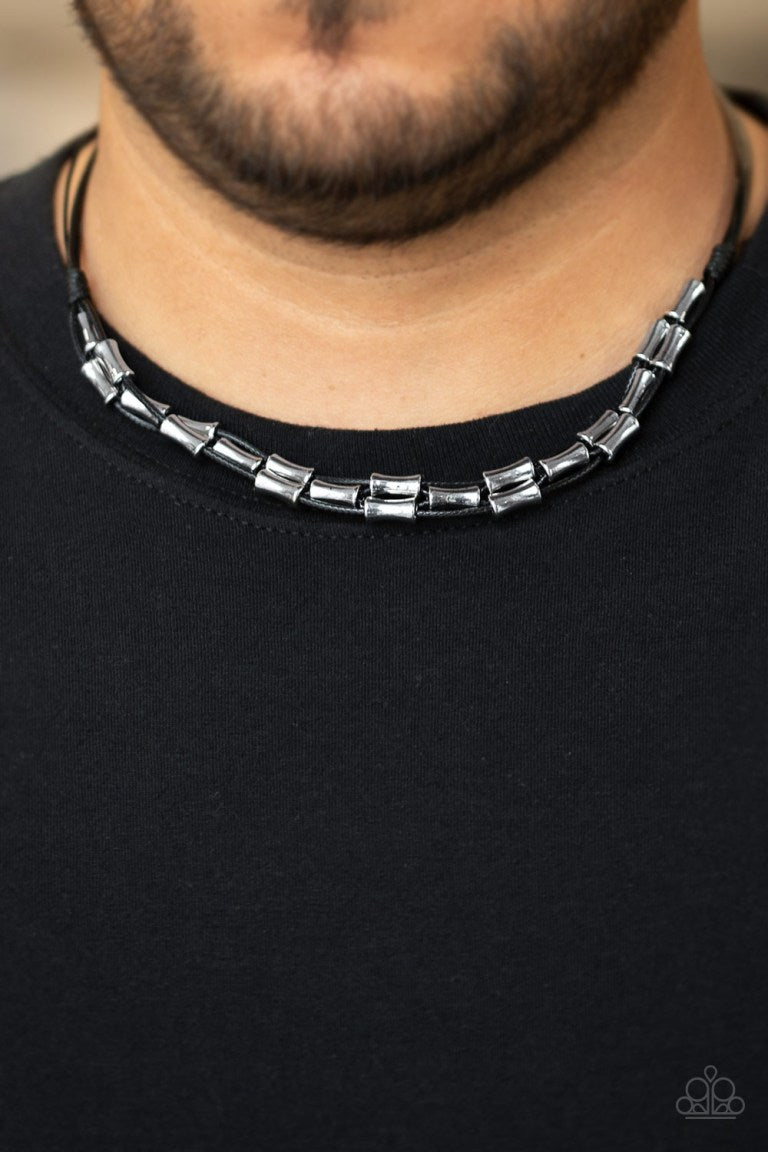 Shiny black cording weaves through a collection of glistening silver beads below the collar for an edgy, urban look. Features a button loop closure.