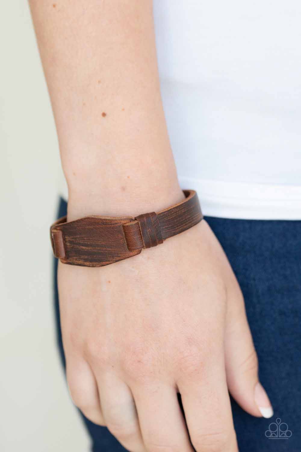 Brown leather bands loop through the edges of an abstract leather piece, creating a rustic centerpiece atop the wrist. Features an adjustable snap closure.