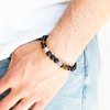 Infused with ornate silver accents, an earthy collection of glassy black beads, tiger's eye stone beads, and black lava rock beads are threaded along a stretchy band around the wrist for a seasonal look.