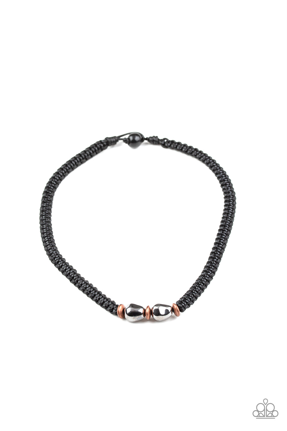 A collection of copper and gunmetal accents are knotted in place along the center of a braided cord for a seasonal look. Features a button loop closure.