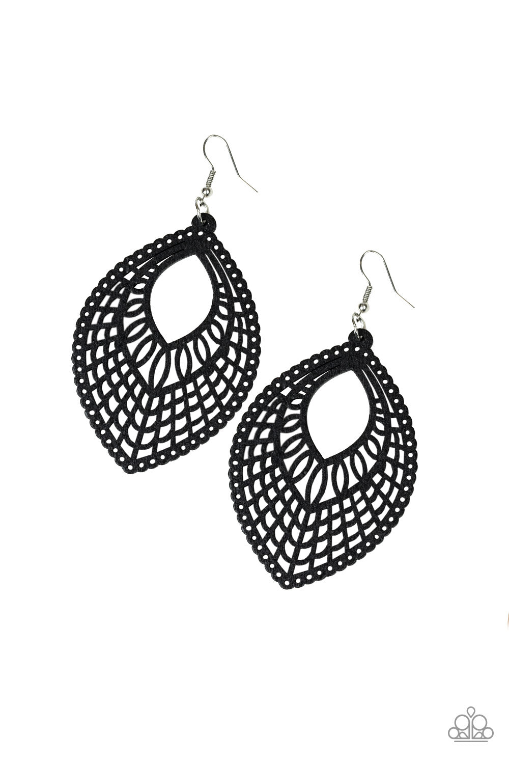 Brushed in a shiny black finish, a stenciled wooden frame swings from the ear in a whimsical fashion. Earring attaches to a standard fishhook fitting.